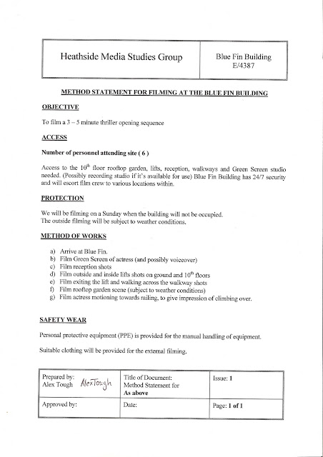 To film at the Blue Fin Building we had to create a method statement to give to the Facilities Director Jenny. This basically just tells her how we plan to go about our filming, because there are no real risks to be taken, a risk assessment is not needed